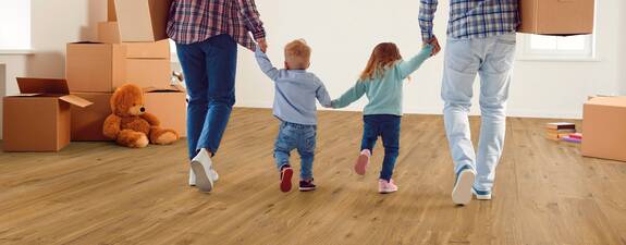 Natürlicher Designboden mit Holz-oder Steinoptik zur schwimmenden, leimlosen Verlegung.